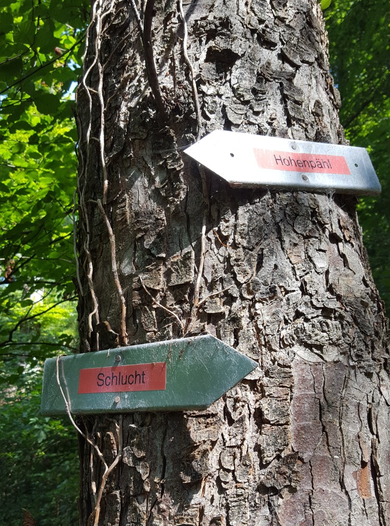 Vom Parkplatz läuft man rechts nur noch 5 Minuten auf einer Golfstraße (vorsichtig fliegende Golfbälle) und dann gehts vor dem Schlosstor rechts bergab Richtung Schlucht. Ein schmaler Weg führte uns tiefer und tiefer zum Bach hinunter.